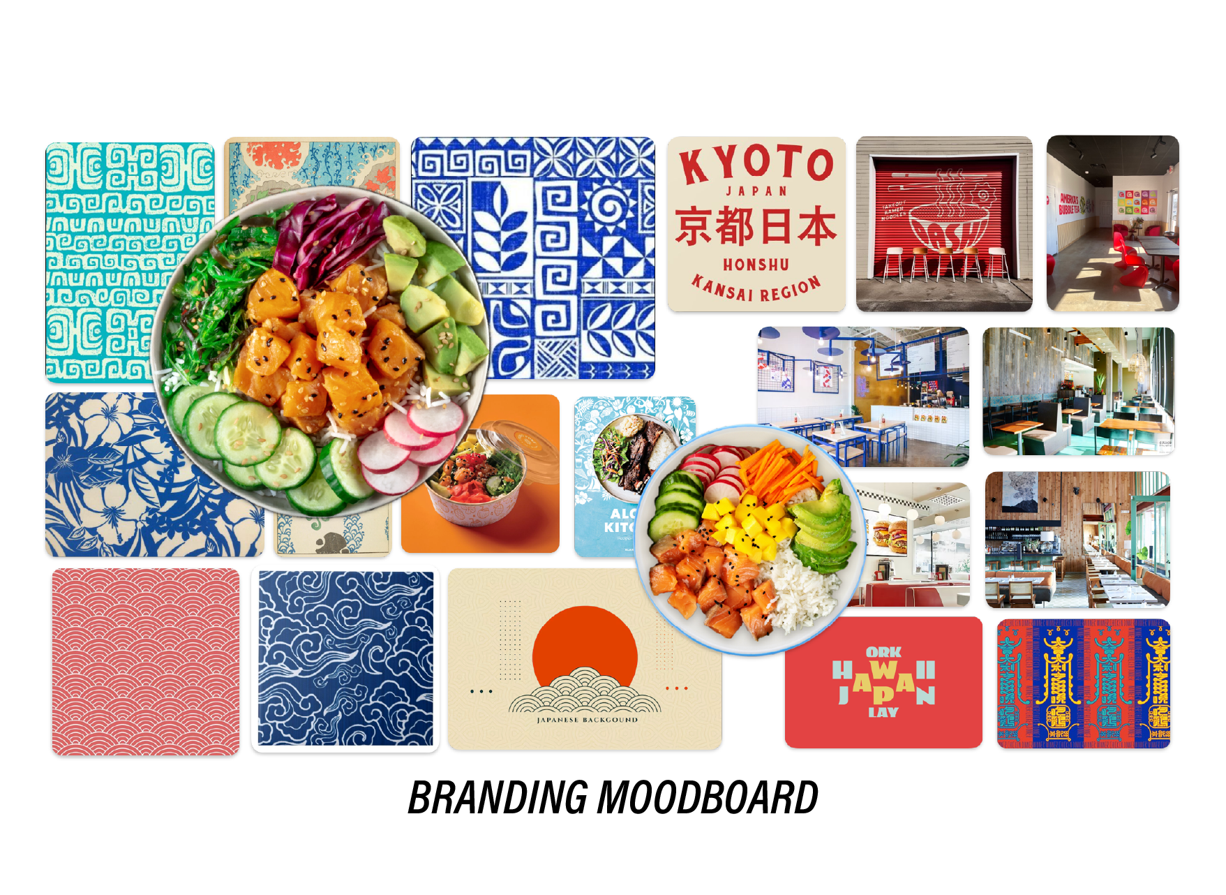 As residents not of Hawaii or Japan, but Texas, we wanted to be as conscious as possible of playing with cultural elements in a smart and respectful way. We collected visual resources and inspirations from Japanese and Hawaiian art and pattern tradition, restaurant design, popular food branding, and architecture.