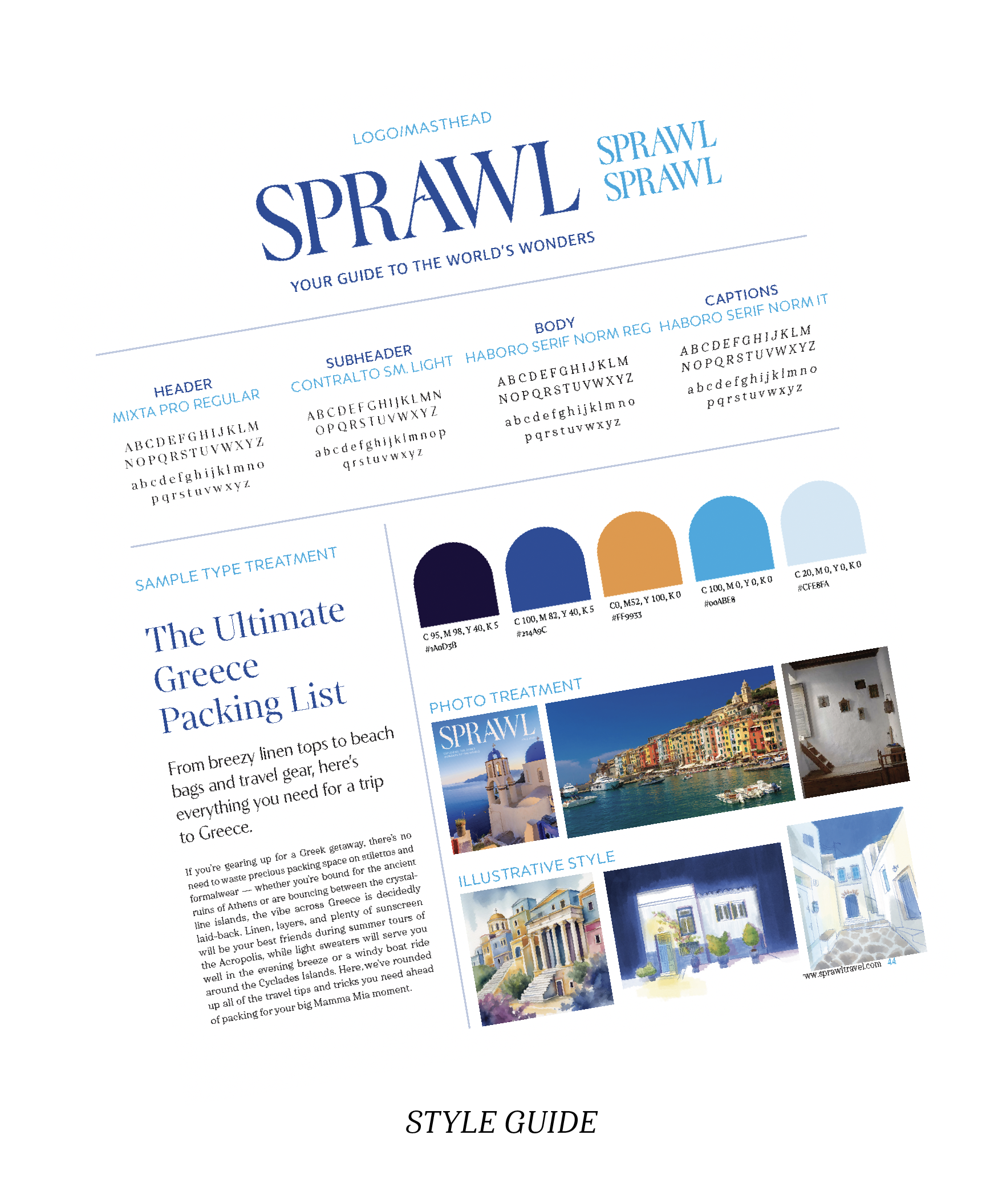 In order to create a strong and successful editorial system, you need a typographic system that can stand the test of many column widths, type sizes, and caption margins. After undergoing a rigorous series of type experiments, I compiled the winning system alongside a charming Grecian color palette, curated photographic and illustrative guides, and a dynamic masthead to create Sprawl’s style guide.