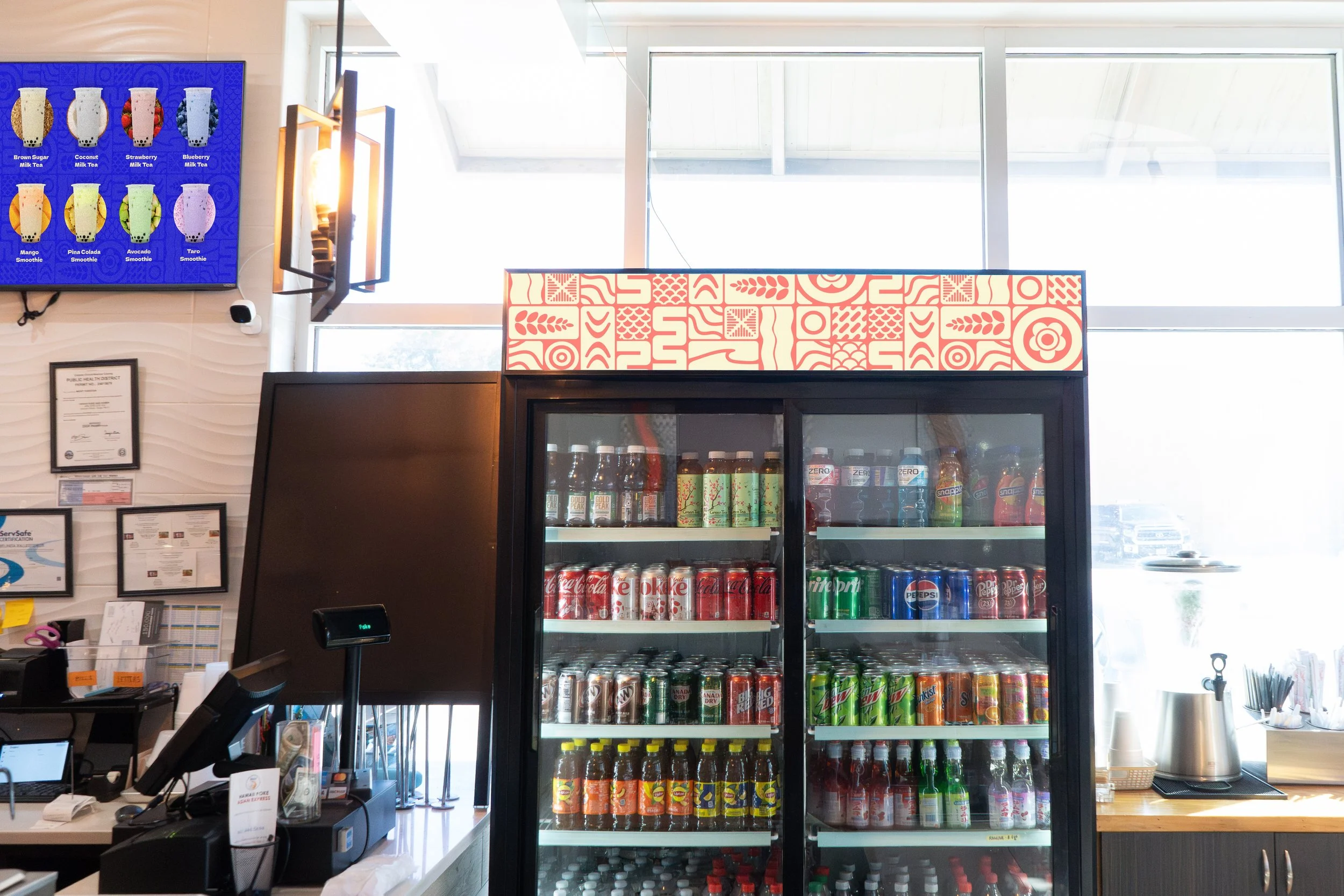 While all major design decisions were made in a partnership, I designed the brand’s logo and pattern, digital menu screens, environmental graphics, and applied potential to-go designs. All work displayed on this site are deliverables I largely designed.